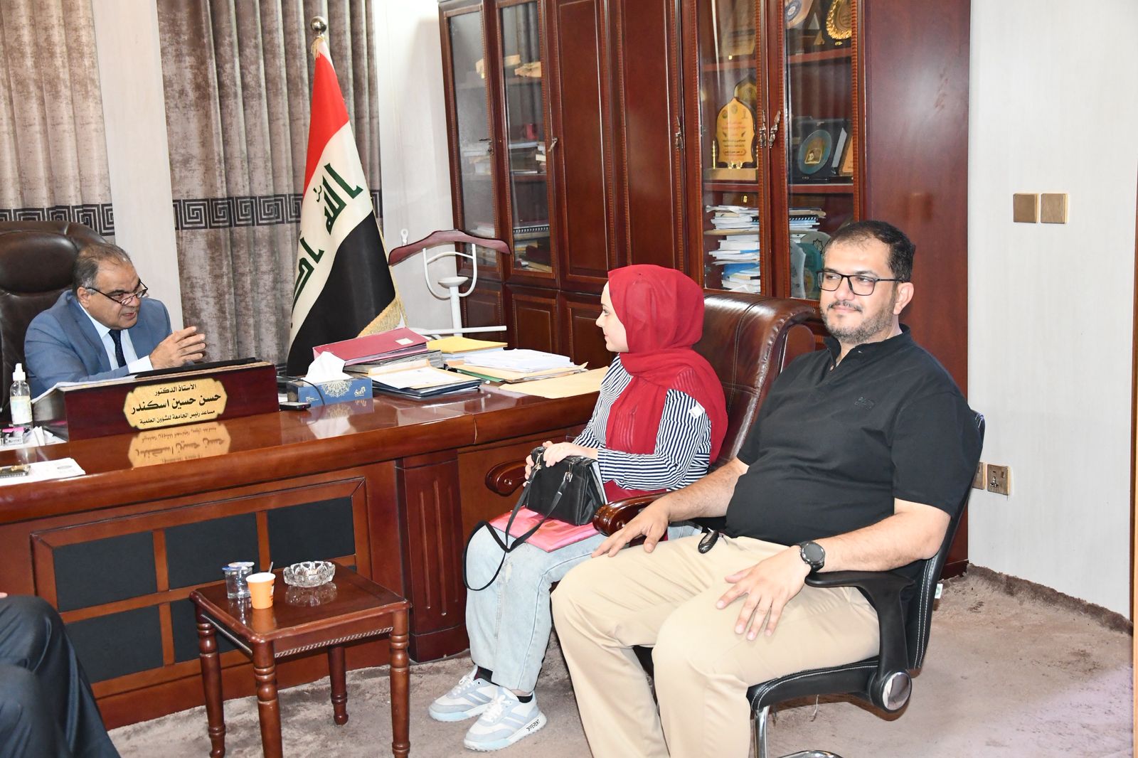 Professor Dr. Hassan Hussein Ibrahim, Assistant President of Tikrit University for Scientific Affairs, received in his office the Syrian student Hala Khudr Al-Ali, who has been admitted to the College of Medicine under the “Study in Iraq” program. The meeting was attended by Professor Dr. Muthanna Ahmed Wakkaa, Director of the Department of Graduate Studies, and Dr. Abdulkhaliq Suleiman, Director of the Department of Scholarships and Cultural Relations