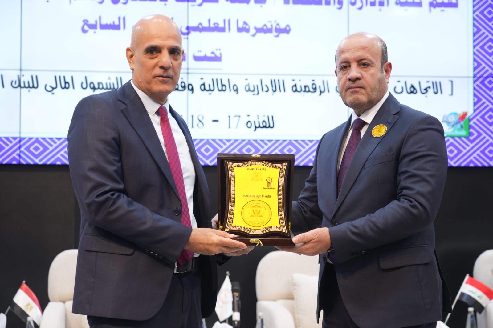 At the conclusion of the opening session, the President of the University, the speakers, and guests were honored with conference shields and shields of the Central Bank of Iraq. The Financial Inclusion Exhibition, organized by the Central Bank of Iraq in cooperation with the Iraqi Private Banks League, was also inaugurated in the courtyard of the College of Administration and Economics.