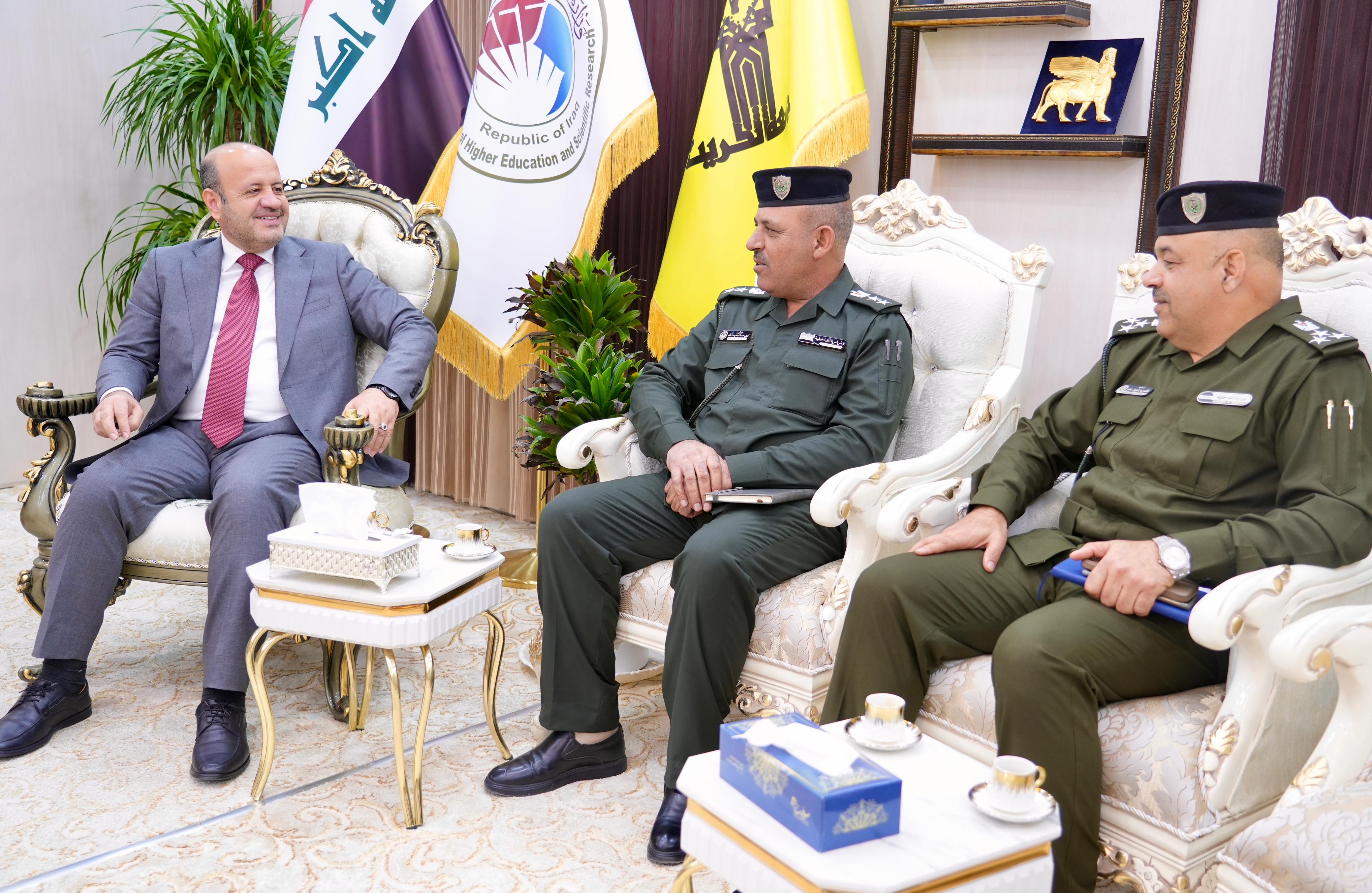 The President of Tikrit University, Professor Dr. Waad Mahmoud Raouf, received in his office both Brigadier General Kareem Aboud Allo, Commander of the Fourth Facilities Protection Sector in Salahuddin Province, and Colonel Louay Salem Abdullah, Director of Al-Alam Police Department.