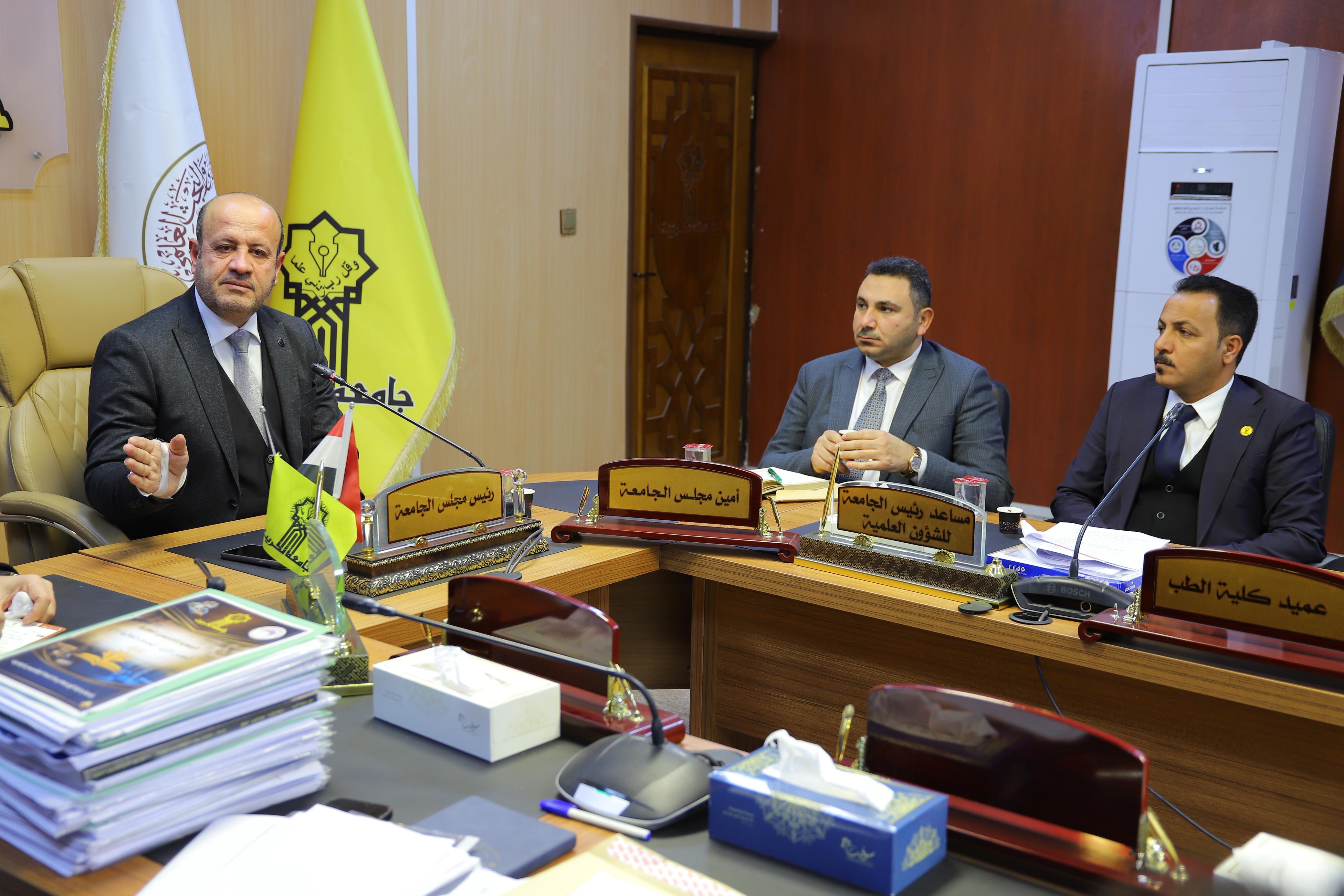 The President of Tikrit University, Professor Dr. Waad Mahmoud Raouf, met on Monday with the members of the Central Committee for Evaluating Institutional Accreditation Reports at the University Presidency, as part of ongoing follow-up on institutional accreditation procedures and the assessment of the level of progress achieved in the university’s colleges and centers.