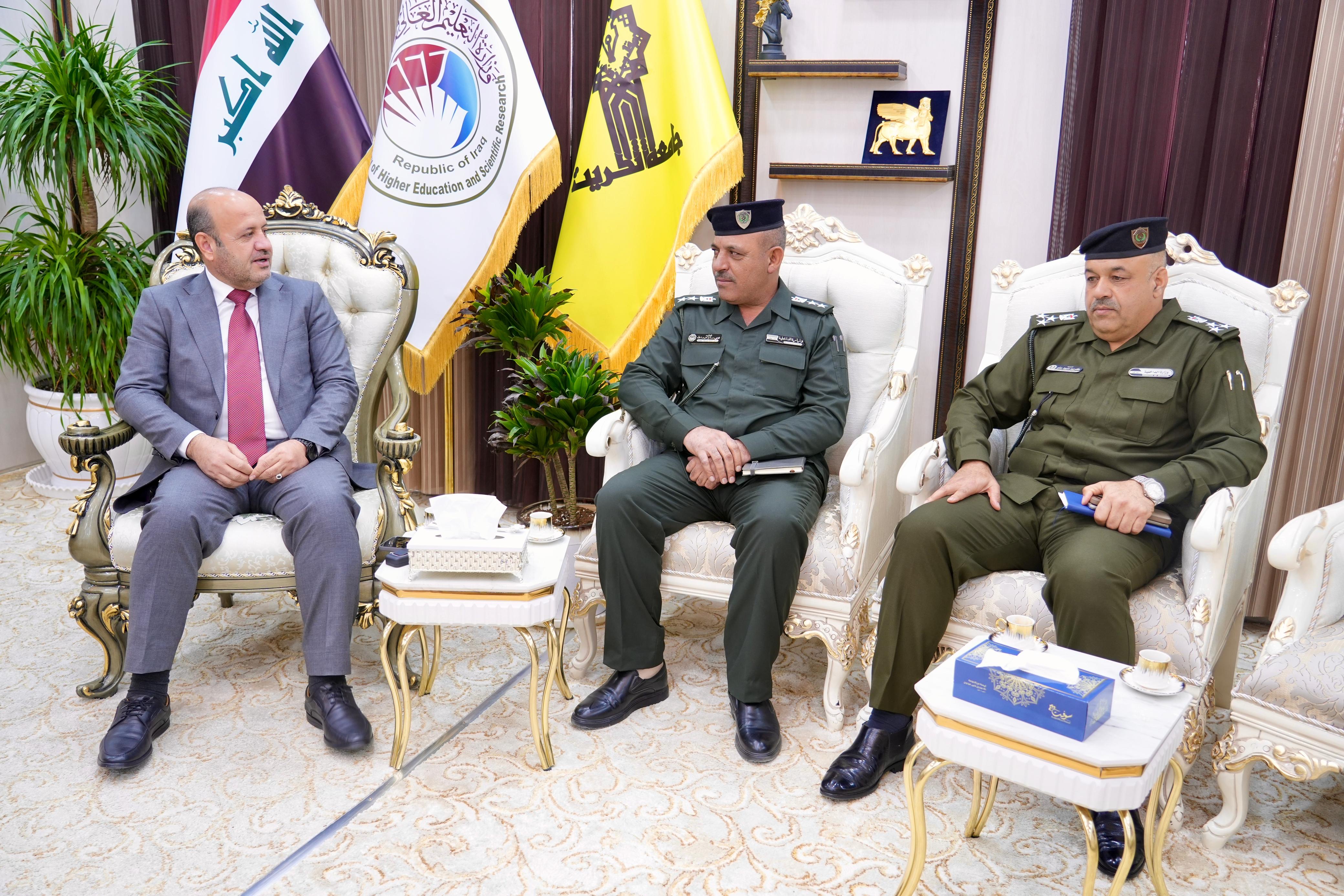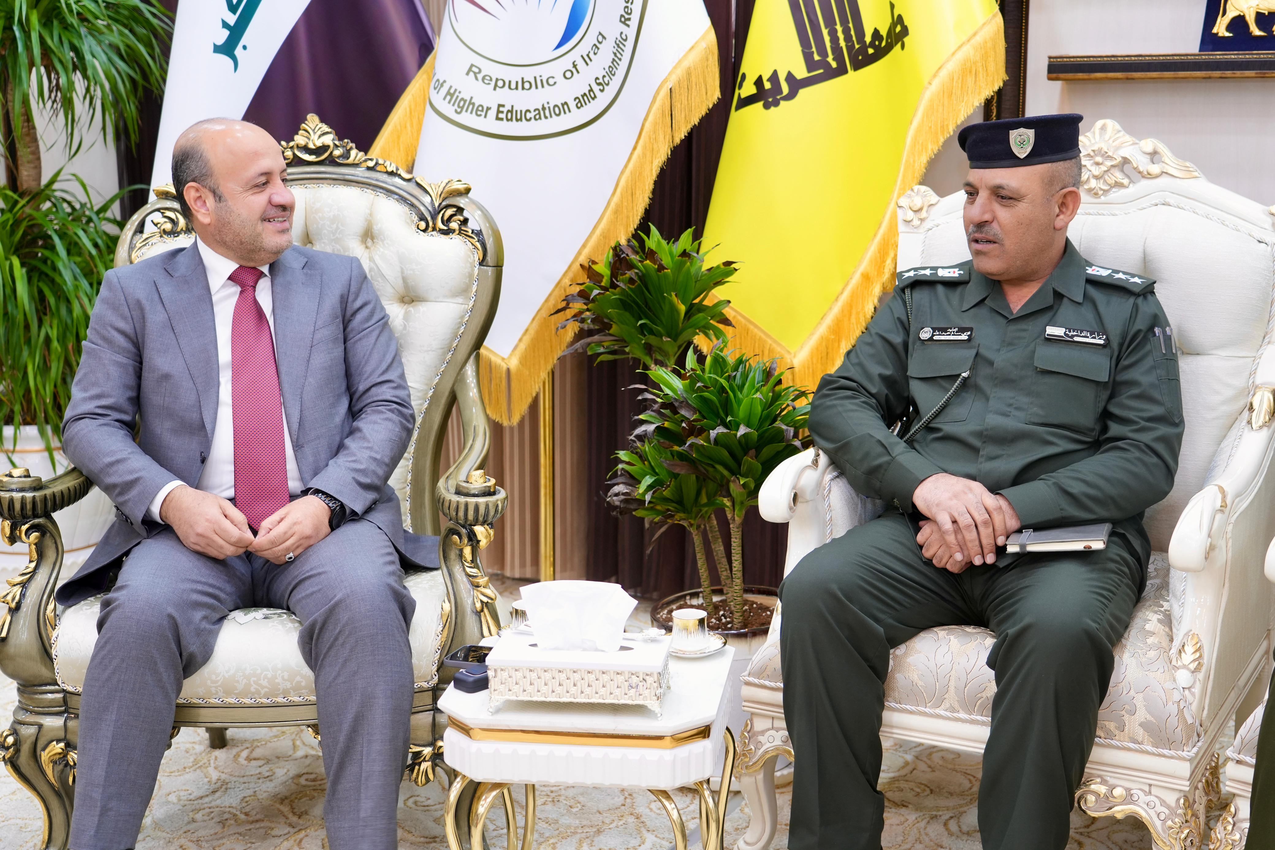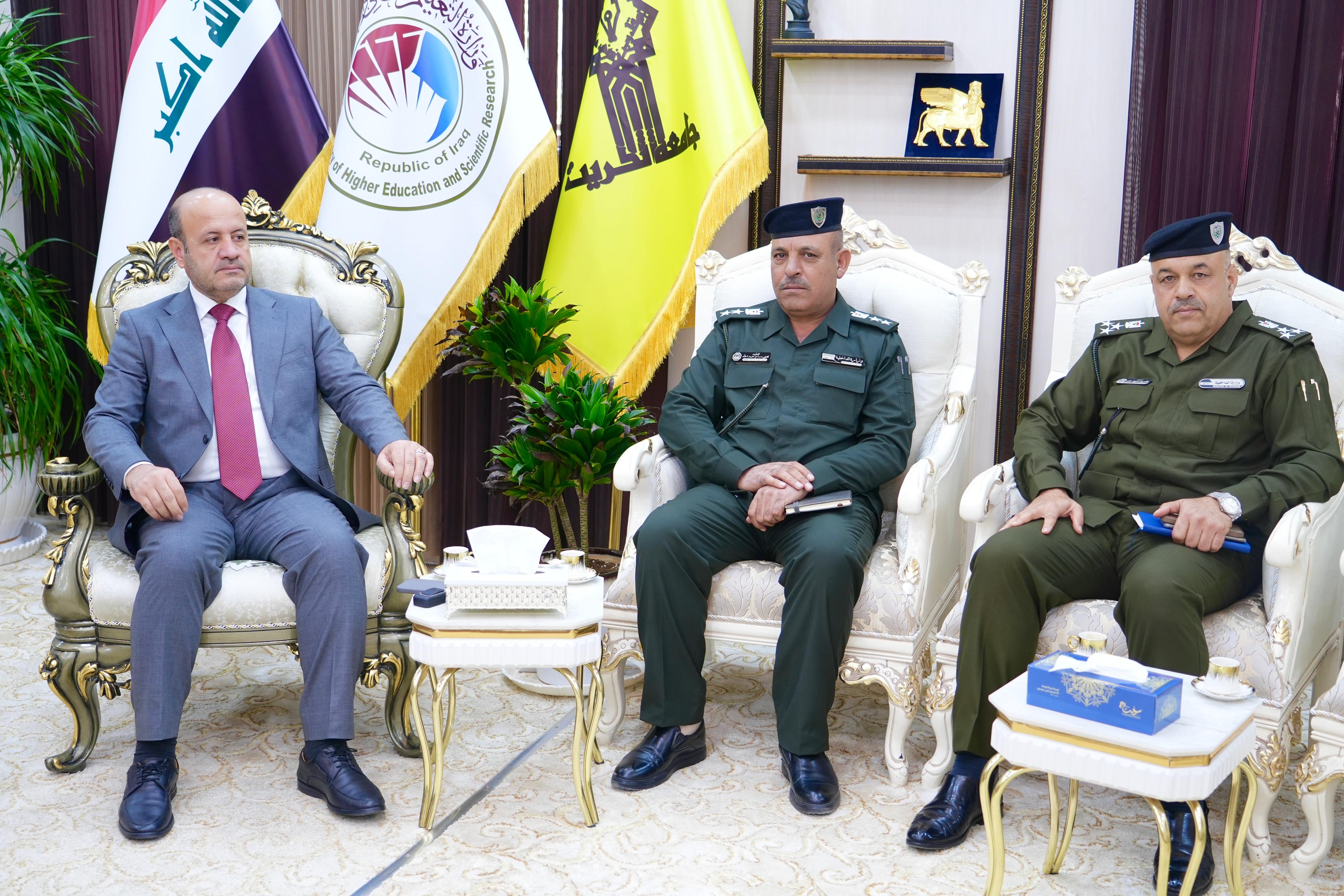 The President of Tikrit University, Professor Dr. Waad Mahmoud Raouf, received in his office both Brigadier General Kareem Aboud Allo, Commander of the Fourth Facilities Protection Sector in Salahuddin Province, and Colonel Louay Salem Abdullah, Director of Al-Alam Police Department.