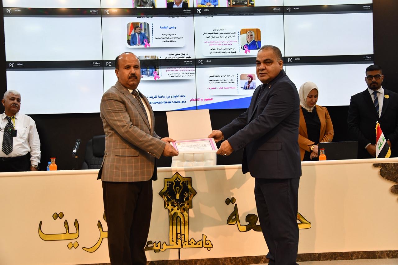 Under the patronage of the President of Tikrit University, Professor Dr. Waad Mahmood Raouf, and the supervision of the Assistant President for Scientific Affairs, Professor Dr. Hassan Hussein Ibrahim, with the follow-up of the Dean of the College of Political Science, Professor Dr. Qasim Alwan Saeed, the Women’s Affairs Unit at the University Presidency organized, in cooperation with the Prime Minister’s Office / the National Committee for Community Awareness and Guidance and the Salahuddin Health Directorate — and with the participation of reputable Arab and international universities and scientific institutions — the 10th International Hybrid Forum on Confronting Breast Cancer, titled “From Knowledge to Dignity” and held under the slogan “From Pain Comes Meaning,” in celebration of Pink October.